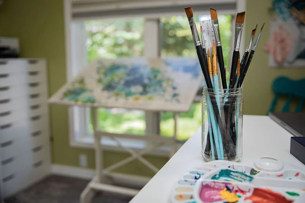 In my studio, you’ll find me in my element—surrounded by colored pencils, gouache paints, and my trusty iPad and laptop. The walls are a patchwork of inspiring fabrics, textures, and the ever-evolving pieces of my art practice.